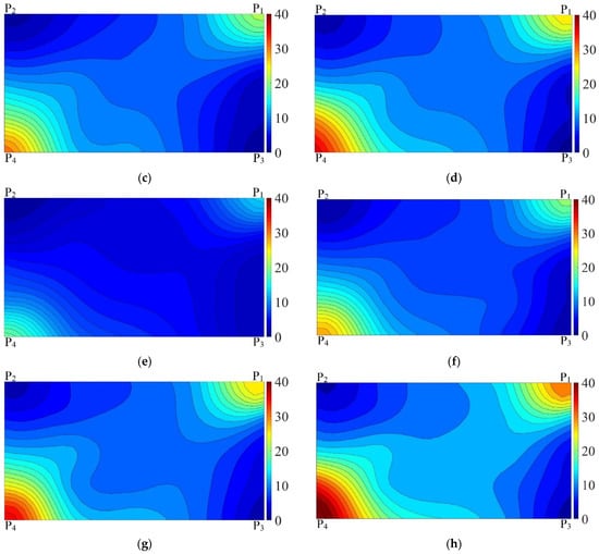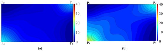 After inputting the coordinates and stress values of each testing point, MATLAB generated the cold-bending stress nephograms and continuous stress contours on the lower surface of the glass panels, as shown in Figure 5. It can be seen from the figure that the cold-bending stress distribution on the lower surface of the specimens was uneven, with the smallest stress being observed at the corner points P2 and P3, with relatively small stress at the panel center. The maximum cold-bending stress appeared near the corner of the short-side direction adjacent to the cold-bending corner, which was the position of testing point S30, and the second-largest cold-bending stress appeared near the corner of the long-side direction adjacent to the cold-bending corner, which was the position of testing point S14. The average value of the second-largest cold-bending stress values across specimens was calculated to be 71.1% of the average value of the maximum cold-bending stress values. The two adjacent edges of P3 were fixed, while the two adjacent edges of P2 were free. Consequently, when the displacement occurred at P2, the curvature radius on the long side became larger than that of the short side, leading to smaller cold-bending stress on the long side.