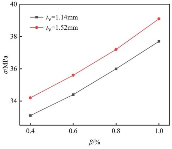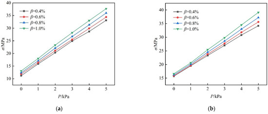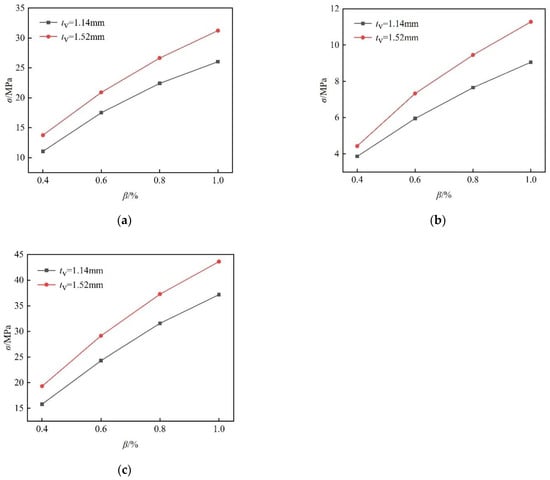 Moreover, it can be seen from Figure 10 that the two relation curves were almost parallel, and the curve with larger interlayer thickness was located above the other one with smaller interlayer thickness, suggesting that the glass panel with a large interlayer thickness has greater coupling stress. Besides, the glass is a linear elastic material, and the influence of interlayer material on the coupling stress was linear since the relationship between the coupling stress and uniform load was revealed as linear.