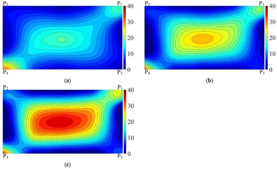 Coupling stress nephograms of SJ4 in the uniform load tests (MPa). (a) Uniform load is 1 kPa; (b) Uniform load is 3 kPa; (c) Uniform load is 5 kPa.