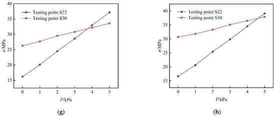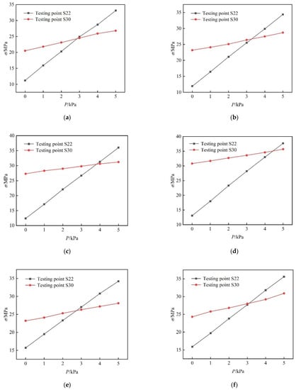 The coupling stress values at testing points S22 and S30 for each specimen during the uniform load test are listed in Table 3 and Table 4, respectively. Both tables exhibit a significant positive correlation between the coupling stress and the uniform load. The relationships between the coupling stress and uniform load at testing points S22 and S30 are depicted in more detail in Figure 8. Both points demonstrated a linear correlation between the coupling stress and the uniform load. The coupling stress at testing point S30 was greater than that at S22 when the uniform load was initially applied and the bearing capacity of the glass panel was controlled by the cold-bending curvature. However, the coupling stress at testing point S22 grew faster than S30 and even exceeded S30 at a certain uniform load. At this time point, the bearing capacity of the glass panel was controlled by the uniform load instead of the cold-bending curvature. With such a change in the control factor of bearing capacity, the corresponding uniform load increased with greater cold-bending curvature.