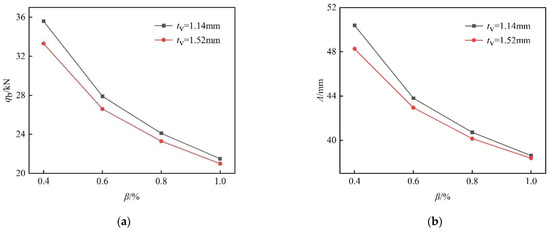 Besides, it can be seen from Figure 11 that the two curves of different interlayer thicknesses showed very similar shapes and a relatively close mutual distance. Therefore, the interlayer thickness was demonstrated to show a slight influence on qb and Δ. Moreover, the two curves exhibited a tendency to converge as the cold-bending curvature rose. At a cold-bending curvature of 1.0%, the two curves almost overlapped, indicating that if the cold-bending curvature were to exceed 1.0%, the interlayer thickness would have a negligible influence on the qb and Δ values of the cold-bent SGP laminated glass panels.