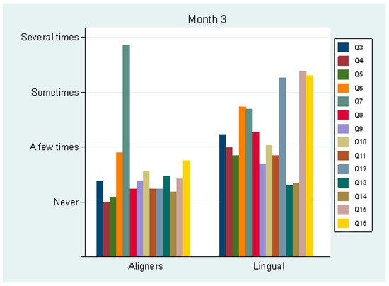 At month 3 (T3), pain perception was not statistically significant (p = 0.240) between the aligner (mean score 2.5 ± 2.1) and the lingual group (3.0 ± 0.7). Only one patient took analgesics in each group (in the aligner group, this was the patient with the least adherence to wearing the appliances). The use of analgesics was more frequent at the beginning of the treatment compared to the third month. Regarding Q3–16, statistically significant differences between the groups were detected in all questions (p < 0.005), except Q13 and Q14, i.e., sores on cheeks/lips were equal between the groups (“a few times”, 25% and 27%, respectively) (Figure 2). All but one statistically significant difference favored the aligner group. The two groups differed in total Q3–16 score (transformed to a 0–100 scale, 0, best score; 100, worst score): 13.9 (±8.6) for the aligner group and 32.1 (±8.7) for the lingual group (p < 0.001). Therefore, it was considered more difficult to speak, swallow, open the mouth and sleep in the lingual group. Additionally, these patients reported higher scores in avoiding foods, change in the sense of taste, sore tongue and food debris under the appliance.