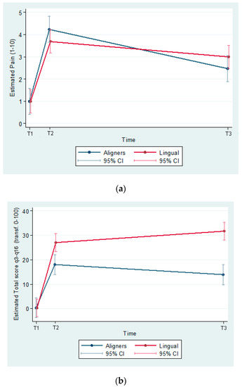 The estimated differences (95% C.I.) between groups (Aligners–Lingual) at T1 was 9.1 (3.4, 14.7); p = 0.002 and at T3 18.2 (12.6, 23.9) (p ≤ 0.001). Between T2 and T3, the HRQoL score increased non-significantly in the lingual group (p = 0.152) and decreased non-significantly (p = 0.075) in the aligners group (Figure 3a,b).