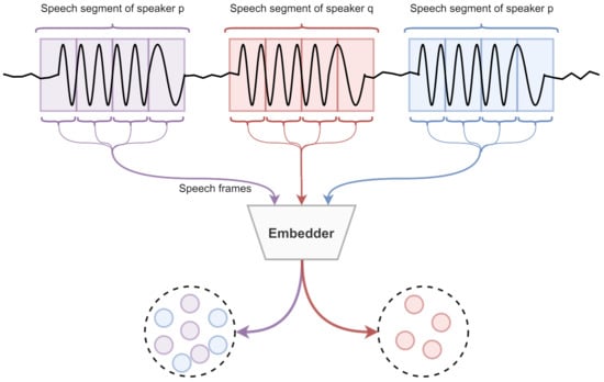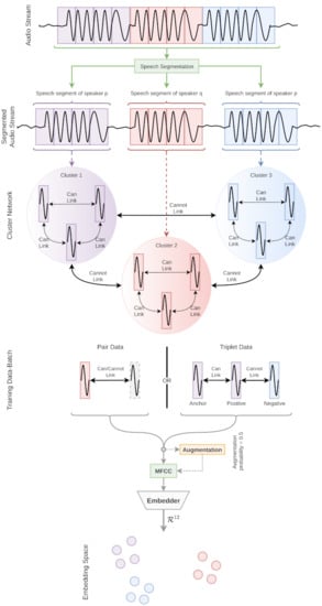 - Let us consider a dataset containing multiple speakers’ conversations, where a single audio stream may include various speakers. In such a case, no pairwise constraints are known, and an unsupervised strategy is required. Hence, we produce hypothetical pairwise constraints based on audio segmentation processes such as VAD, word segmentation [], etc., and construct pairwise constraints. However, in such a case, the embedding system’s accuracy depends on the purity of the audio segmentation process.