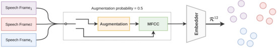 The training of both pairwise and triplet networks is done through the same data processing pipeline. Half of the inputs are randomly augmented and processed using MFCC. The MFCC of each frame is further passed to the DL frameworks.