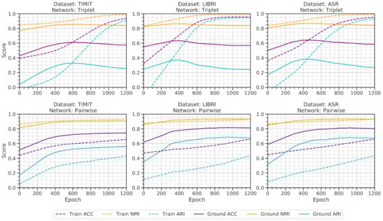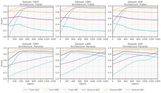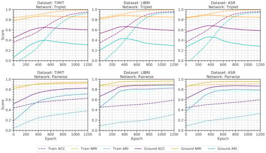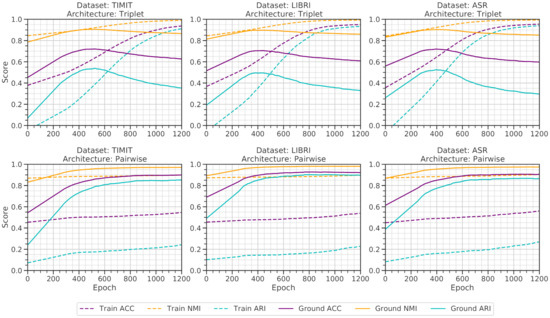 In this section, the proposed scheme is experimented based on the impurity of speech segmentation. As the architecture’s target is to produce clusterable embedding, we use k-means to measure the purity of the clusters generated by the embedding system. Further, three popular metrics, Accuracy (ACC), normalized mutual information (NMI), and adjusted rand index (ARI), are used to measure clustering effectiveness. The metrics are calculated as demonstrated in [], and are widely implemented to refer to the purity of clustering [,].