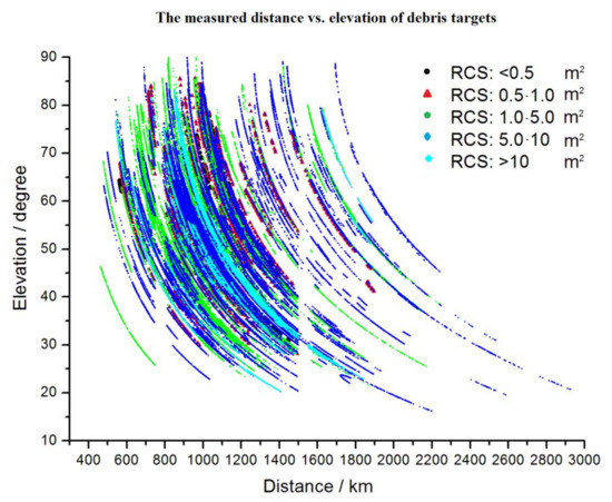 The laser measurement of debris was performed by updating the range gate generator, a data acquisition unit, and data process software of the DLR system. Figure 2 shows the observation results of the DLR system at SHAO for hundreds of laps of DLR data. The x-axis and y-axis are the measured distance and the elevation of the observation, respectively. It is seen that the farthest measured distance is nearly 3000 km. The RCS is equivalent to 0.26 m2 at a distance of 1000 km.