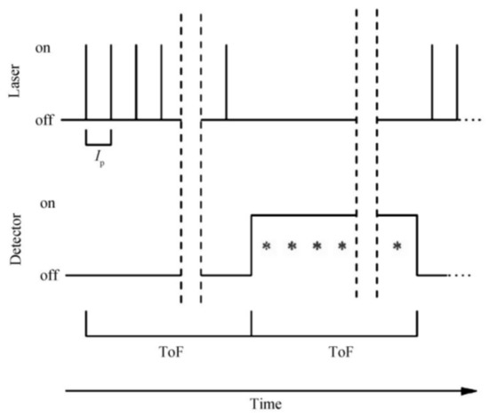The procedure of the above mode is shown in Figure 4, where Ip is the time interval between laser pulses within the group (5 µs for 200 kHz), on/off refers to the working status of the laser and detector, and ToF is the flight time of the laser from the ground to the target. The working time length of the alternating mode is calculated according to ToF, and the number of laser pulses within the time of flight is calculated as: