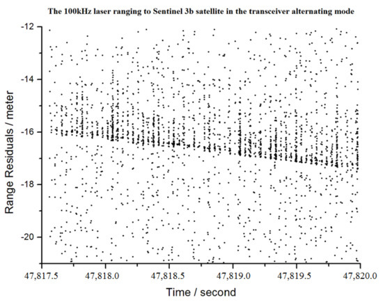 By updating data acquisition software and range gate generator, 100 kHz laser ranging was performed to track satellites with a laser retroreflector using the SHAO laser ranging system. Figure 5 shows the measurements of the Sentinel-3B satellite at a PRF of 100 kHz with single pulse energy of 40 uJ in wavelength of 532 nm. The range residuals for 100 kHz measurements are plotted in Figure 5, where the laser echo signals appear periodically because of laser transmitting and receiving alternately. In the next step, we have a plan to apply 100 kHz SLR technology to DLR measurements and develop 500 kHz laser ranging technology.