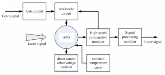 A wide range gate and low noise level of laser detection are required to handle the large-ranging error coming from poor accuracy of debris orbit prediction. The avalanche photodiode (APD) detector technology with a low level of dark noise, high efficiency (>40%), and high sensitivity have been developed [21]. Additionally, a large chip is required to ensure that the detector has a sufficient optical receiving field of view. The APD detector in the Geiger mode operation works at a voltage higher than the breakdown voltage to realize sufficient gain, after the photons are absorbed, the detector can quickly avalanche output to meet the requirements of single-photon detection and realize higher detection efficiency and sensitivity, as shown in Figure 6.
