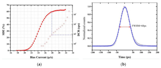 Since 2015, SHAO has cooperated with the Shanghai Institute of Microsystem and Information Technology to develop the first SNSPD for high-precision laser ranging [22]. This detector has a photosensitive surface diameter of 100 μm, the detection efficiency was up to 60% with a bias current of 28 uA as shown in Figure 7b, the dark noise (DCR) was less than 10 Hz, and also the time jitter was 68 ps, as shown in Figure 7b. The laser echo signals received in the 200-µm-diameter core of the fiber are focused on the SNSPD by an aspheric lens.