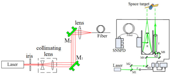 Various satellite internet constellation programs, such as the One Web, SpaceX Starlink, Telesat, and Hongyan constellations, will launch thousands of satellites into orbit to provide global broadband internet services, which will greatly affect the Earth’s orbital resources. Space debris has become an important factor threatening space safety. The European Space Agency issues early warnings of collisions between space debris and spacecraft more than 50 times per year on average, and the number of collision avoidance maneuvers required annually has reached 22 [5]. Ensuring spacecraft safety after launch requires the orbits of space debris to be determined accurately. Compared with microwave technology for tracking space debris, laser technology is characterized by a short wavelength, small divergence angle, good directivity and monochromaticity, and strong anti-interference. A laser can be used for a real-time measurement technology with a ranging precision reaching a sub-decimeter level, which is two orders of magnitude better than the ranging precision of a microwave radar or optical telescope. The use of a laser improves the accuracy of the determination of the space debris orbit and plays an important role in enhancing spacecraft collision warning capabilities [4,5,6]. Many countries, including the United States, Australia, Austria, Russia, Poland, and China, have developed high-precision laser ranging technology for debris laser ranging (DLR) [7,8,9,10,11,12,13]. The International Laser Ranging Service [14] established a space debris laser tracking and measurement working group in 2014 to promote the research and application of high-precision space debris measurement technology and allow the high-precision monitoring and early warning of space debris in space activities, which will enhance the early warning capabilities of space targets for space situational awareness.