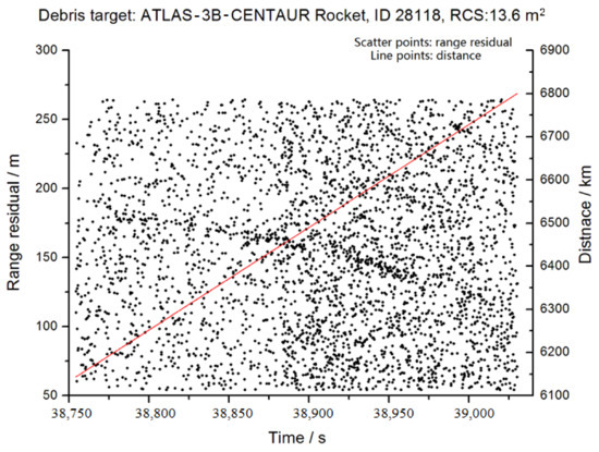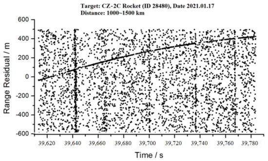 The technologies of the DLR measurements were implemented at the SHAO, which enable ranging measurements of small and far space debris at a distance of 1700 km (with an RCS of 0.05 m2, catalog ID 1520) and at a distance exceeding 6700 km (with an RCS of 13.6 m2, catalog ID 28118), as shown in Figure 11 and Figure 12, respectively. These observations mark the first time that debris targets have been measured up to a distance of 6700 km.