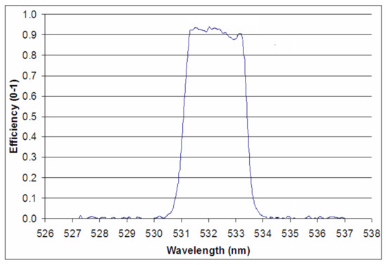 SHAO developed a DLR system with a telescope having an aperture of 1.8 m and a laser system having a PRF of 200 Hz, pulse energy of 300 mJ and a wavelength of 532 nm. However, the noise from the background and debris targets was several times greater than that of the SHAO’s DLR system with a telescope having an aperture of 60 cm, which affects the laser echo detection and then deteriorates the detection capability. Narrow spectral filters are commonly used to reduce the level of background noise in a laser measurement system by using the homochromy of the laser signal (e.g., a high-efficiency narrow-bandwidth spectral filter). Figure 10 shows the transmittance of a narrow-bandwidth spectral filter. The main characteristics of the filter are a central wavelength of 532 nm, a bandwidth of ±1 nm, and a transmittance of greater than 90% at a wavelength of 532 nm.