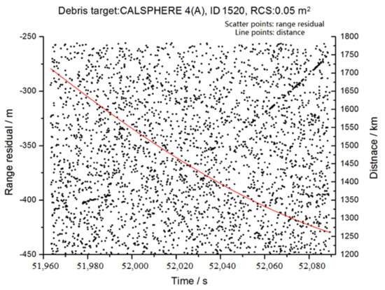 DLR measurements were performed applying the above pulse-burst picosecond laser system to the existing DLR system of SHAO. Figure 20 shows the measurements of the Long March CZ-4 debris target (ID 20853, RCS 0.6 m2). The debris ranging precision is 16.4 cm, which gradually improves as the size of the debris decreases. Among the measurements, the longest ranging distance is 1726.8 km (with an RCS of 0.91 m2, which is equivalent to an RCS of 0.1 m2 at a distance of 1000 km). Figure 21 shows the good detection ability, with the x-axis is the RCS of targets and the y-axis is the measured range and precision of the targets. Employing the pulse-burst mode, the average power of the laser system can be increased by summing the number of laser pluses. This increase in power will allow the long-distance ranging of small debris in the future.
