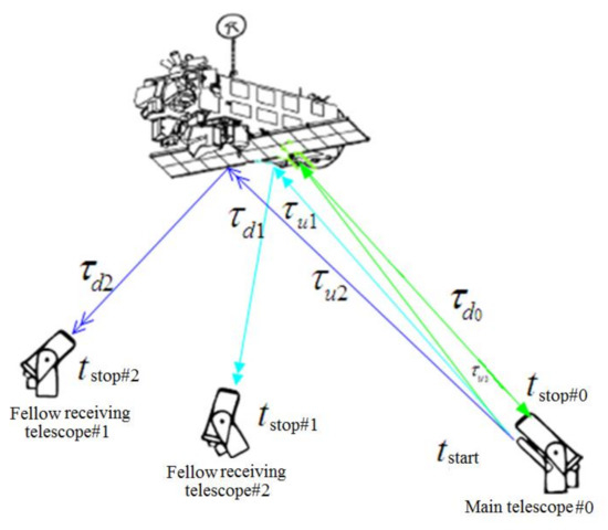 Using the clock of a global navigation satellite system to solve the time synchronization of the two separate telescope systems and considering the actual transmission path of a laser signal, the range gate control of the remote receiving telescope has been realized for laser ranging measurements. Figure 14 illustrates the multi-static measurements of a telescope array. The range gate value is for the main telescope (#0), for the fellow receiving following telescope (#1), for the fellow receiving telescope (#2), respectively. Considering the negligible differences in , , and for the same target, the range gate values can be calculated based on the laser-signal uplink time from the main telescope and downlink time to the respective following telescopes.