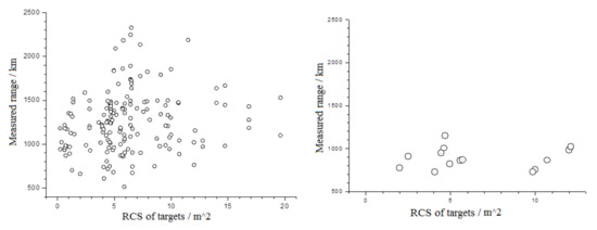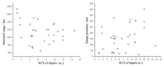 This divergence angle (θ) is much less than the one at the transmitting telescope. According to the laser ranging link equation, the number of laser echo photons increases in inverse proportion to θ2. For the previously mentioned nanosecond laser (60 W, 200 Hz, and a pulse width of 8 ns), the peak power density is approximately 0.74 MW/cm2, which is lower than that of the 4.2 W picosecond laser system, consequently, its nonlinear effect is weak. Figure 17 shows the measurements for the 60 W nanosecond laser (left) and 4.2 W picosecond laser (right). The x-axis and y-axis present the RCS of targets and the measured range of the targets, respectively.