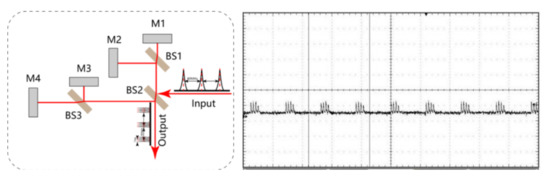 For the picosecond laser with a PRF of 1 kHz, it have high peak power, but the average power and single-pulse energy cannot be increased easily. Therefore, a pulse-burst picosecond laser was developed by SHAO for the DLR to achieve high power and large single-pulse energy. A Michelson interferometer was used to achieve narrowly spaced pulse bursts, as shown in Figure 18 (left). BS1, BS2, and BS3 denote beam splitters with transmission rates of 50% whereas M1, M2, M3, and M4 denote zero-degree total reflectors coated at a wavelength of 1064 nm. Each zero-degree total reflector corresponds to a pulse generator in a burst. Pulses in bursts with equal spacing Δt were obtained by increasing the lengths of M1 to BS1, M2 to BS1, M3 to BS1, M4 to BS1 to ΔL [28,29]. Here, we took the length ΔL = 150 mm and a pulse spacing of Δt = 2 × ΔL/c = 1 ns (where c is the speed of light). Pulses of a mode-locked picosecond laser with a PRF of 80 MHz are divided into four pulses in Figure 18 (right).