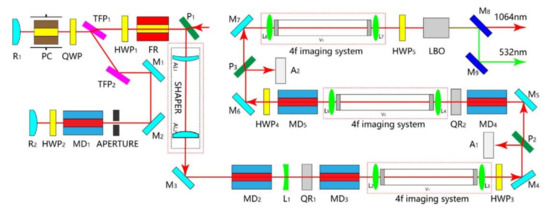 Schematic of an optical system for a high-power nanosecond laser with a PRF of 200 Hz.
