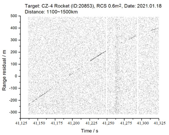 SHAO applied the SNSPD detector to the centimeter-level-precision laser ranging of satellites and sub-decimeter-level-precision laser ranging of debris targets. Figure 9 shows the laser range residuals for the debris of the CZ_2C rocket, which is characterized by less noise and an obvious laser signal. The ratio of signal to noise was up to 1.9, higher than that of the APD detector, as shown in Table 1. This result demonstrates the advantage of the high signal-to-noise ratio for the SNSPD detector.