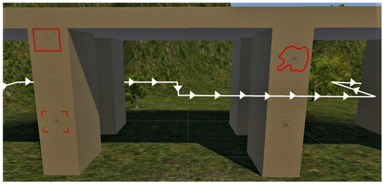 Simulated bridge environment with all saliency levels and augmentation types represented. The top left target is the low saliency target (0.12) with the bounding box augmentation, the bottom left target is the medium saliency target (0.17) with the corner-bound augmentation, the top right target is the high saliency target (0.22) with the outline type augmentation, and the bottom right target is the non-augmented, high saliency target. The white line denotes the movement the simulated drone made during each trial. Note that this graphic is for visual representation only and that during experimental trials, only one saliency type and one augmentation type would appear for each trial. © 2021 IEEE. Reprinted, with permission, from J. Van Dam, A. Krasner and J. L. Gabbard, “Drone-based Augmented Reality Platform for Bridge Inspection: Effect of AR Cue Design on Visual Search Tasks,” 2020 IEEE Conf. Virtual Real. 3D User Interfaces Abstr. Work., pp. 201–204, 2020, doi:10.1109/VRW50115.2020.00040.; J. Van Dam, A. Krasner, and J. L. Gabbard, “Augmented Reality for Infrastructure Inspection with Semi-autonomous Aerial Systems: An Examination of User Performance, Workload, and System Trust,” 2020 IEEE Conf. Virtual Real. 3D User Interfaces Abstr. Work., pp. 743–744, 2020, doi:10.1109/VRW50115.2020.00220.