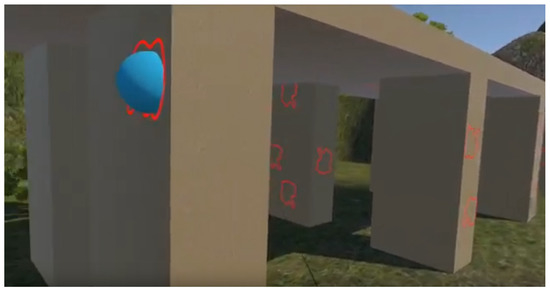 The simulated drone in the testbed followed a set flight path, but allowed participants to control the orientation of the simulated gimbled camera by moving their head with the worn VR HWD. As participants went through the simulation, they were asked to find and select targets using ray casting via a Vive Pro hand controller. For this work, we use the term targets to refer to bridge defects, which we modelled to be visually similar to those seen on real world bridges, but which still allowed us to modify them to adjust their detectability. The targets appeared randomly on the bridge’s surface and required the participant to move their head to see all the targets as they passed through the different sections of the simulated bridge.