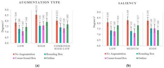 Graph of jerk with augmentation type and saliency. Levels of jerk magnitude are shown on both graphs with the left graph (a) showing jerk levels for each augmentation type and the right graph (b) showing jerk levels in the different saliency conditions. Simulated computer vision accuracy groups (low, high, and combined) are show on of the left graph (a) and levels of augmentation saliency (low, medium, and high) are shown in the panels of the graph on the right (b). Error bars reflect the standard error of the mean.