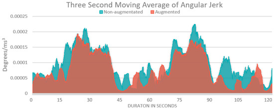 The main effects were present for augmentation type [F (3,78) = 4.10, p = 0.009, η2partial = 0.136], but did not reach significance for saliency type (p = 0.987), nor did the augmentation–saliency interaction (p = 0.876), or the interaction of augmentation–saliency–CV accuracy interaction (p = 0.406). As shown in Figure 3a, post hoc comparisons showed that a decrease in jerk magnitude was significantly associated with the use of augmentations with pairwise comparisons showing significant differences between no augmentations (M = 8.20 deg/s3) and the bounding box (p = 0.003; M = 7.41 deg/s3), corner-bound augmentation (p = 0.002; M = 7.33 deg/s3), but not for the outline augmentation (M = 7.68 deg/3) and no augmentation pair (p = 0.52). Pairwise comparisons between the three augmentation types themselves did not reach statistical significance as all p values were greater than 0.5. As shown in Figure 4, the three second moving average graph of angular jerk, gross levels follow similar trends and patterns in both the augmentation and non-augmented conditions, but with greater intensity and more spikes in the non-augmented conditions.