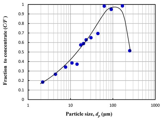 A size analysis of coal particles transferred from the feed to the concentrate product was conducted. From the size distributions and the mass flow rate of the concentrate and feed measured, a performance curve for the column was constructed. Figure 2 shows a plot of the fraction of solids recovered in the concentrate (C/F) versus particle size. The trend is as expected in flotation cells, in that the recovery is maximal in the range 30–100 and decreases for fine and larger particles. Typically, flotation performance is highest in the region of intermediate particle size and decreases at the finer and larger sizes. There are lots of effects, such as mineral liberation, floatable mineral, reagents, flotation time etc. However, in terms of particle–bubble interaction, finer particles may be the low collision and attachment efficiency to bubble, which have insufficient inertia to cross the water streamlines around the coursing bubble []. In case of coarse particles, this is due to the high detachment probability to bubble including decreased mineral liberation [,].