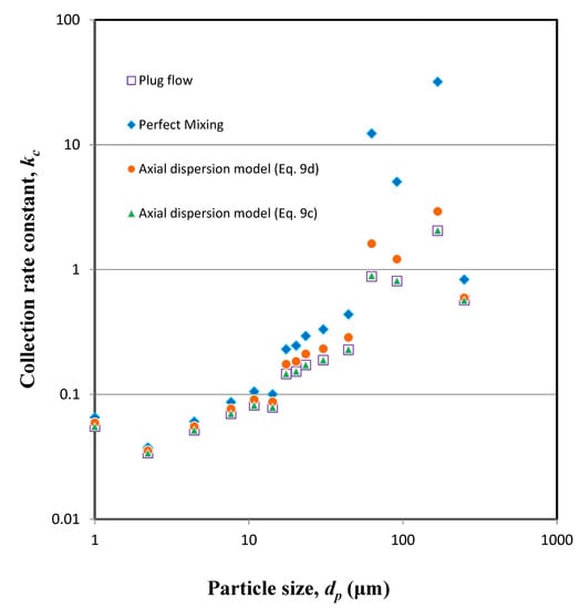 Based on the performance curve in Figure 2, the mean particle residence times of particles were calculated using Equation (16) and used in Equations (14), (15) and (18) to estimate the flotation rate constants that correspond to plug flow, fully mixed, and axial mixing conditions. Figure 3 shows the variation of these rate constants against particle size. It shows that the flotation rate constants are similar below about 40 . It is, as expected, as the residence time of finer particles equals that of the water. Furthermore, it has been also reported that, for finer particles, solid axial mixing is the same as fluid axial mixing []. For intermediate particle sizes, the estimated rate constants vary considerably but those evaluated using plug flow and axial dispersion are closer to each other than those due to a perfect mixing model. In particular, in the case of coarse particles, the deviation is large in the case of perfect mixing, while axial mixing is suitable. Thus, it has been shown that the mixing characteristics of a flotation column affect the flotation rate constant, particularly for coarser particles. Thus, it shows that the axial mixing is prevalent in columns under the operating conditions tested and the perfect mixing model is not suitable for modelling small column performance. Normally, the mixing characteristics in column are considered to be between that of plug-flow reactors and fully mixed tanks. In addition, the axial-dispersed model can describe the hydrodynamics of laboratory or pilot scale columns properly, but due to the limitations it cannot be used for industrial columns [].