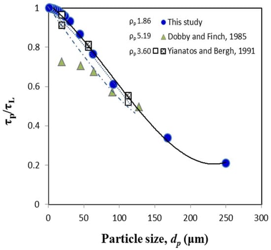 A consequence of mixing is its effect on the residence time distribution of particles and the liquid. Figure 4 shows the ratio of the residence times of particles and liquid against particle size. As can be seen, this ratio decreases with particle size from unity at small sizes to lower values at coarser sizes. The points corresponding to this study agrees well with Yianatos and Bergh [] but deviates from those of Dobby and Finch [], particularly for finer particles. It may be due to their assumption that the axial dispersion coefficient is equal for both liquid and particles. It also illustrates the effect of solids density as Dobby and Finch data were obtained for particle density of 5.19 and the coal used in this study has a density of 1.86. The data of Yianatos and Bergh had a density of 3.6 and are close to those of this study. As can be seen from the figure, the effect of solids density is to decrease the ratio (, particularly for finer particle sizes. The fact that the particle residence time varies with the degree of mixing is important in determining the performance of flotation columns.