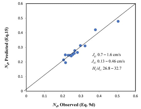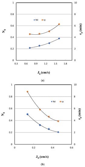 Intensity of axial mixing is related to vessel dispersion number, residence time distribution, superficial gas velocity, and the column diameter, etc. []. The effect of vessel dispersion number, Nd, which is a measure of the degree of mixing and the particle residence time (), are affected by both superficial flowrate of gas and slurry/water as shown in the Figure 5. As can be seen, it increases with Jg and decreases with Jsl. An increase in the vessel dispersion number with an increase in the superficial gas velocity is because of the increase in the gas holdup. The increased gas holdup results in the phenomenon of cloud bubbles generated from an increase in the aeration rate, and it then increases the axial mixing due to the turbulence [,]. The superficial slurry velocity deceases the gas holdup, and then liquid/slurry volume of downstream leads to a reduction in the axial mixing.