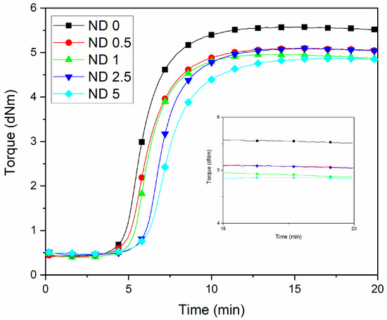 Rheometric curves of NR/BR compounds at different ND/CB concentrations.