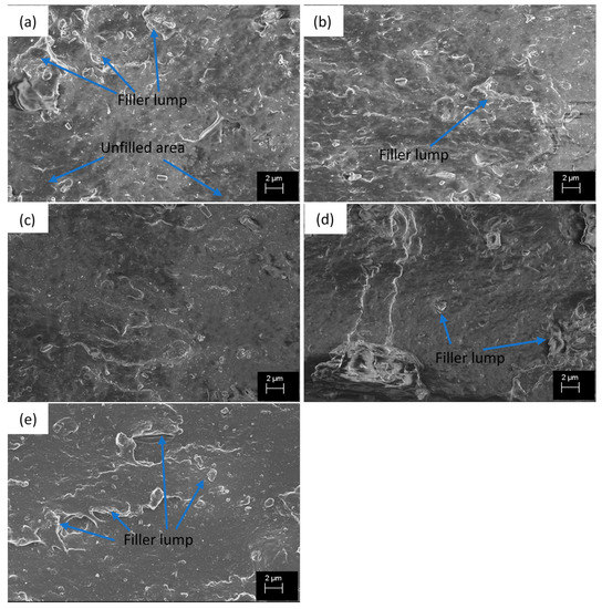 The SEM images (Figure 2) show some differences in filler dispersion and distribution in different compounds, although ND particles cannot be distinguished separately. The reference compound (Figure 2a) containing only CB as filler has well dispersed areas but also unfilled and agglomerated areas. In addition, the compound containing 0.5 phr (Figure 2b) NDs has an irregular surface caused by the large agglomerates, which is evidence of insufficient dispersion. Figure 2c,d shows that the filler dispersion is improved. The surface is rather smooth, large filler agglomerates do not exist (except for the two filler agglomerates in Figure 2d), and the fillers seem to be more evenly distributed than in the reference compound. The improved dispersion explains the earlier Payne effect results. At 5 phr ND concentration, the filler dispersion becomes poorer again and the large agglomerates are found (Figure 2e), which is the reason for the decreased filler-filler interaction observed from the Payne effect.