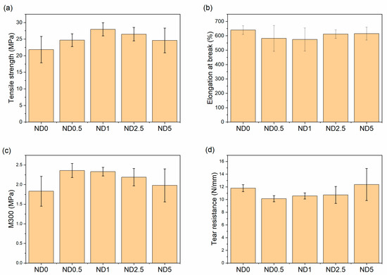 The effect of NDs on the mechanical properties (a) tensile strength, (b) elongation at break, (c) 300% modulus, and (d) tear resistance.