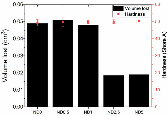In tear resistance results the trend is opposite (Figure 3d). The tear resistance decreases when 0.5–2.5 phr CB is replaced by NDs but increases again at 5 phr NDs. This is related to the plasticizing effect of NDs and filler dispersion. The poor interface between NDs and rubber as well as the reduced mechanical trapping of polymer chains weakens the tear resistance at low ND loadings. The big standard deviation at higher ND loadings also indicates the poor dispersion of fillers. In addition, wear resistance is improved after addition of 2.5 and 5 phr NDs, although change in hardness is nonexistent (Figure 4). The harder surface of NDs helps rubber to slide on the smooth steel surface. The improvements in wear resistance as well as reduction in friction coefficient after addition of NDs has also been found for acrylonitrile butadiene rubber, fluororubber and epoxy [25,45,47]
