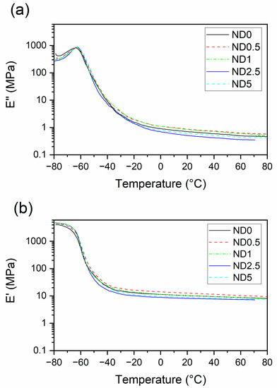 Dynamic properties play an important role in several rubber applications, such as tires or dampers. Figure 5 presents the storage and loss moduli of the compounds as a function of temperature. The storage modulus curve can be divided into three stages: the glassy region, glass transition and the rubbery region. In the rubbery plateau region, the storage modulus is the highest when 0.5 phr CB is replaced by NDs, possibly due to the improved filler dispersion. When the ND loading increases, the storage modulus decreases. At the same time, a reduction in loss modulus is observed for higher ND loadings due to the plasticizing effect [25] and decreased polymer-filler interaction.