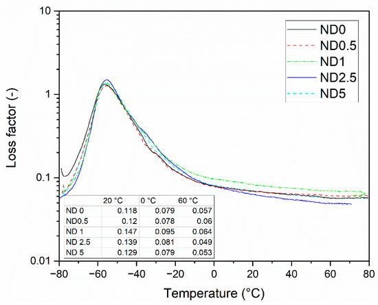 The loss factor of the compounds is presented in Figure 6. The gradual replacement of CB by NDs has only minor influence on the peak intensity. This behavior differs from the behavior of CNTs. The height of the loss factor peak decreases when CB is partially replaced by them due to the restricted mobility of the polymer chains [14]. In this case, only the compound containing 0.5 phr NDs show this effect, and still the effect is minimal. The addition of the higher amount of NDs results in the higher peak, thus NDs improve the mobility of the polymer chains. However, they do not affect the glass transition temperature. The loss factor curve is used to predict the tire properties, such as wet grip and rolling resistance. At −20 °C, the loss factor is improved when 1 or 2.5 phr CB is replaced by NDs, which indicates better grip on ice. At 0 °C, the temperature used to predict the wet grip, the compound containing 1 phr NDs shows the highest loss factor and thus the best wet grip in tire applications. The loss factor values at 60 °C are used as an indicator for the rolling resistance. At this temperature the loss factor is increasing when 0.5 or 1 phr CB is replaced by NDs, indicating the poorer polymer-filler interaction of NDs and the chain slipping of polymers. However, at a 2.5 phr ND concentration, the loss factor is remarkably lower than without NDs. Hence, the ND-CB filler combination has potential to reduce the rolling resistance in tires with proper concentrations.