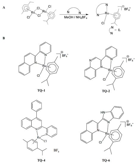 Application of organometallic ruthenium complexes have been increased for the different types of cancer treatment, and also regularly applied as potential alternatives for existing therapeutic strategies. This metal complex is also a prominent alternative to platinum as it is suitable for balanced anticancer drug design [28]. Thus, ruthenium metal complexes are measured as the most inspiring anticancer agents. So far, NAMI-A and KP1019 ruthenium complexes have entered clinical trials. NAMI-A is an active drug against lung cancer [29]. Studies on the anticancer activity of ruthenium (II) complexes have significantly increased, as numerous Ru(II) complexes display encouraging anticancer effects [30,31]. The increasing use of Ru(II) complexes on cancer cells provides more insight into their bioactivity, to support several medical claims. We identified the antiplatelet and antithrombotic effects of several new ruthenium complexes [32,33,34]. Novel ruthenium complexes, such as [Ru(pyridin-2-yl)-quinoline)(η6-p-cymene)Cl]BF4 (TQ-1), [Ru(2-(pyridin-2-yl)-quinoxaline)(η6-p-cymene)Cl]BF4 (TQ-2), [Ru(diphenyl-2(pyridin-2-yl)-quinolin-6-yl)-amine)(η6-p-cymene)Cl]BF4 (TQ-4) and [Ru(2-(1H-benzoimidazol-2-yl)-quinoline)(η6-p-cymene)Cl]BF4 (TQ-6) have been prepared according to the method described by Li et al. [35] for their anti-inflammatory evaluation. Synthetic methods of the ligands and complexes are shown in Figure 1A,B.