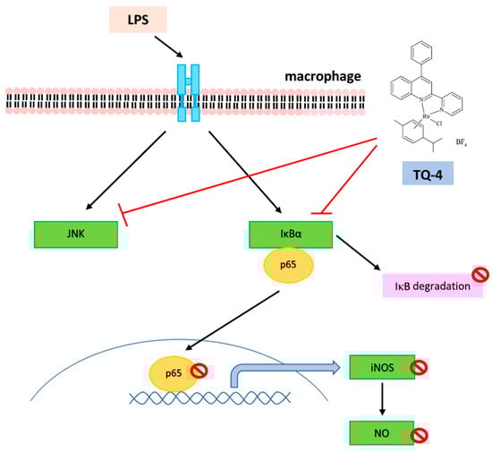 Proteins that are associated with mitogen-activated protein kinases (MAPKs) and NF-κB pathway have been scrutinized to distinguish the mechanisms of TQ compounds on their protective effects against inflammatory events. Studies have projected that over activation of MAPKs, including ERK, p38 and JNK involve in controlling inflammatory cytokines and mediators in activated macrophages, and hence, suppression of MAPK activation is reported to reduce the expression of inflammatory mediators and improves inflammatory disease [44]. Our previous study found increased phosphorylation of p38MAPK, ERK and JNK in LPS induced macrophages [39]. Jayakumar et al. have found that among the compounds tested (TQ-1, 2 and 4) only TQ-4 inhibits the phosphorylation of JNK, but not p38 and ERK in the LPS-induced mice liver and RAW cells (Figure 4) [39]. Similarly, a study has detected the anti-inflammatory effects of selenium coated nanoparticles via inhibition JNK1/2, but not ERK1/2 phosphorylation of [45]. From these results, it can be proposed that JNK contributes critical role for the anti-inflammatory effects of ruthenium TQ-4.