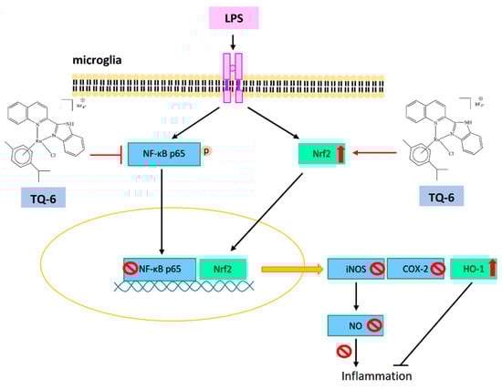 Nuclear factor kappa B (NF-κB) transcription factor is an upstream regulator of inflammatory mediator NO, and a major target for treating inflammatory diseases [46]. Evidence has proved that NF-κB activation in microglia stimulates the expression of proinflammatory cytokines and activators [47]. Inhibition of NF-κB signaling in microglia was proposed as the major target of drugs to exhibit the protective effect against the neuropathology of ischemic stroke [48]. As shown in Figure 2 and Figure 3, LPS induces NF-κB activation and its nuclear translocation and IκBα degradation in LPS treated macrophages was found to be recovered by TQ-4 [39] and TQ-6 [42].