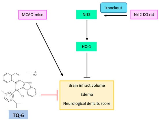 Nuclear factor erythroid 2-related factor 2 (Nrf2), a key transcription factor, plays a vibrant role in controlling oxidative stress-mediated inflammatory responses. Normally, Nrf2 is stored in the cytoplasm with its inhibitor Keap1. In an activated state, like NF-κB, this transcription factor translocates into the nucleus and regulates the transcription of antioxidant enzyme HO-1 [49]. An investigation stated that Nrf2 deficient mice are more vulnerable to LPS-induced neuroinflammation [50]. Additionally, Nrf2 activation in microglia attenuates neuroinflammation via inhibiting NF-κB-associated inflammatory mediators [14]. For instance, thymoquinone, a major component of Nigella sativa inhibits neuroinflammation by activating Nrf2 and inhibiting NF-κB [51]. Thus, we also explored the anti-inflammatory effects of TQ-6 through NF-κB and Nrf2 signaling; the results determined that TQ-6 inhibited NF-κB expression and its nuclear translocation, and also increased the expression of Nrf2 and HO-1 [42]. Nrf2 protects brain cells from ischemic stroke injury, as evidenced by increasing cerebral infarction ratio and neurological deficits score in Nrf2 knockout ischemic reperfusion induced rats [52]. The novel ruthenium compound TQ-6 potently reduced brain infarct volume and edema in middle cerebral artery occlusion (MCAO) induced mice (Figure 5) [42]. Consequently, the protective effect of TQ-6 in microglia by regulating Nrf2/HO-1 could be regarded as an ideal therapeutic target for the treatment of stroke associated inflammatory events.