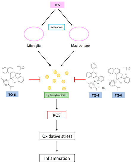Reactive oxygen species (ROS) are generated by a host of exogenous routes. Environmental substances including non-genotoxic carcinogens directly produce or indirectly stimulate ROS in cells. ROS-mediated oxidative stress has been reported to stimulate in response to several xenobiotic compounds. LPS induces generation of ROS and NO along with several proinflammatory cytokines [53]. Several studies have proposed that NF-κB and ROS are the major targets for treating inflammatory diseases via inhibiting pro-inflammatory mediators and liver injury. In the event of ischemia-induced neuronal injury, ROS contribute destructive role by damaging lipids, proteins and nucleic acids, resulting to brain damage and cellular death [54]. An earlier finding discovered hydroxyl radicals (OH•) dramatically increased in LPS-stimulated microglia [42]. LPS stimulates liver injury via increased ROS production and thus antioxidants are regarded as the greatest choice to repair this injury [55]. In this regard, our study had found that Ru compound TQ-6 and TQ-4 potently condensed the raised level of LPS-induced OH•; TQ-4 also potently scavenged (Fenton reaction, Figure 6), signifying that the defending effects of TQ-6 and TQ-4 in microglia and macrophage activation and ischemic stroke may partly be associated with OH• inhibition.