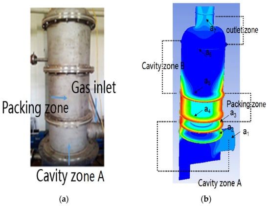 The cross-flow RPB (Figure 1a) consists of housing, liquid inlet and outlet, gas inlet and outlet, liquid distributor and packing. The liquid is introduced through the distributor and then contacts with the gas in a cross-flow way. According to the flow characteristics, the cross-flow RPB is divided into four zones (Figure 1b), including the cavity zone A from gas inlet (plane a1) to 5 mm below the packing (plane a3), the packing zone from plane a3 to 5 mm above the packing (plane a5), the cavity zone B from plane a5 to gas outlet (plane a6, where there is no change in diameter) and the outlet zone from plane a6 to plane a7. Plane a2 and a4 are added in the cavity zone A and packing zone, respectively. The characteristic parameters of the cross-flow RPB and packing are shown in Table 1.