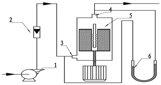 Schematic diagram of the experimental setup: (1) roots blower; (2) rotameter; (3) gas inlet; (4) gas outlet; (5) cross-flow RPB; (6) manometer.