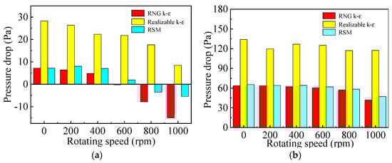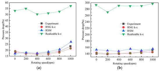The pressure drop in cavity zone A for three turbulence models at different rotating speeds. (a) Gas flow rate of 200 m3·h−1; (b) gas flow rate of 800 m3·h−1.