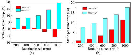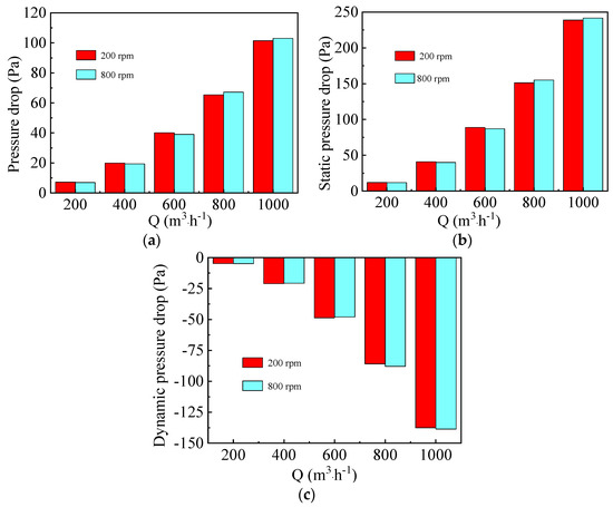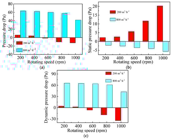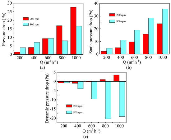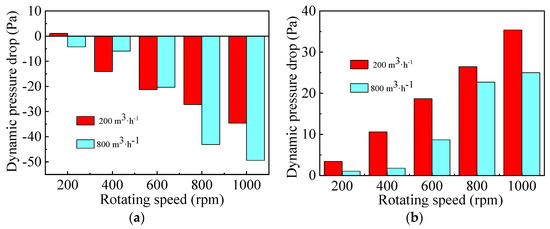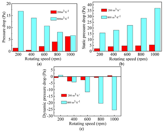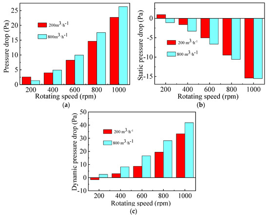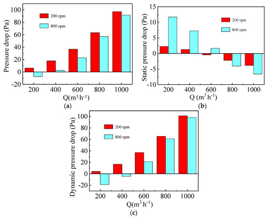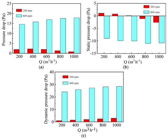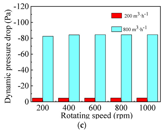 Figure 7c illustrates that dynamic pressure drop first decreases to −4 Pa and then increases to 2 Pa when the gas flow rate and rotating speed are kept at 200 m3·h−1 and 400 rpm, respectively. Finally, it decreases from 2.5 Pa to −28 Pa at gas flow rate of 800 m3·h−1. As shown in Figure 9, the dynamic pressure drop in Section 1 decreases gradually both at low and high gas flow rates, while that in Section 2 increases with the increase of rotating speed from 200 rpm to 800 rpm due to the conversion of more static pressure energy to kinetic and internal energy.