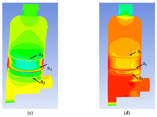 Figure 7b shows that static pressure drop increases slowly at a low rotating speed of 600 rpm because of the conversion of static pressure energy to kinetic energy. Then, the packing zone is subdivided into two parts: Section 1 (plane a3 to plane a4) and Section 2 (plane a4 to plane a5). In Section 1, at a gas flow rate of 200 m3·h−1 and rotating speed of 400 rpm, the static pressure drop increases to a maximum of 2 Pa and then decreases to −5 Pa at a rotating speed of 1000 rpm (Figure 8a). The reason can be explained as follows. The gas velocity in the lateral direction increases more quickly than that in the vertical direction due to the friction of packing, and the gas moves mainly in the lateral direction and collides with the wall, leading to the conversion of kinetic energy to static pressure energy. This is also confirmed by the static pressure cloud. To be more specific, the pressure drop at the edge of the packing area is larger than that in surrounding areas (red color shown in Figure 8c,d). In Section 1, at the gas flow rate of 800 m3·h−1 and rotating speed of 400 rpm, the static pressure drop is kept constant and then increases to 18 Pa at a rotating speed of 800 rpm, which may be attributed to the initial gas distribution. There would be a balance between the increase of static pressure energy by collision and the conversion to kinetic energy at low rotating speeds, and the latter is predominant over the former with the increase of the rotating speed. In Section 2, the static pressure drop goes up to 17 Pa at the gas flow rate of 800 m3·h−1 as the rotating speed is increased from 200 rpm to 1000 rpm due to less collision.