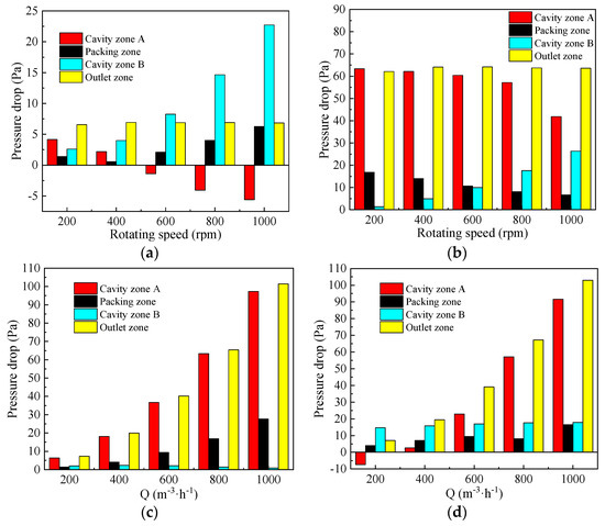 Comparing the pressure drop in different zones. (a) Gas flow rate of 200 m3·h−1; (b) gas flow rate of 800 m3·h−1; (c) rotating speed of 200 rpm; (d) rotating speed of 800 rpm.