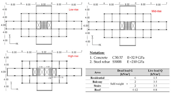 Three symmetric, in plan, reinforced concrete residential buildings were studied in this paper. The three buildings were regular in plan according to EC8 [31], and they had the same external dimensions: 40.00 m in the longitudinal direction and 20.00 m in the transversal direction, as shown in Figure 1. The number of the stories was varied, with the constant height of each story equal to 3.50 m. The first building, mentioned from now on as « Low-rise », consisted of three stories; the second building, mentioned as « Mid-rise », consisted of eight stories; the third building, mentioned as « High-rise », consisted of 15 stories. More details of the construction elements are given in Table 1. The buildings had a structural system for resisting horizontal loads based to walls. Their distribution in plan was symmetric in both horizontal directions to avoid an additional torsional effect.